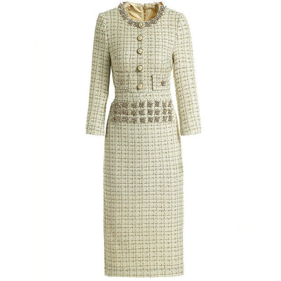 Craquez pour cette magnifique robe tweed dorée à l'allure rétro, idéale pour les grandes soirées. On aime sa coupe droite, ses petits motifs pailletés et son col rond brodé. Si vous êtes à la recherche d'une robe de soirée, elle sera parfaite.