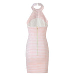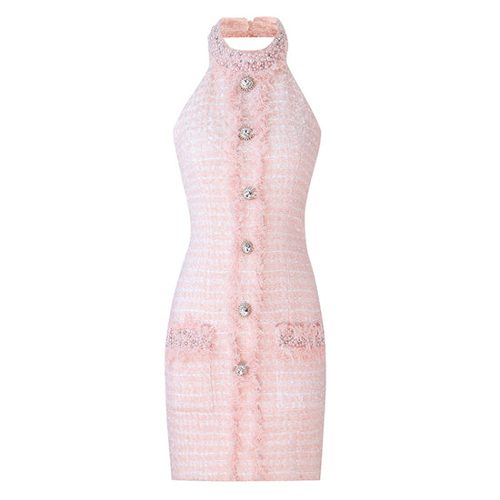 Robe tweed sans manches rose avec boutons dos nu