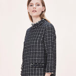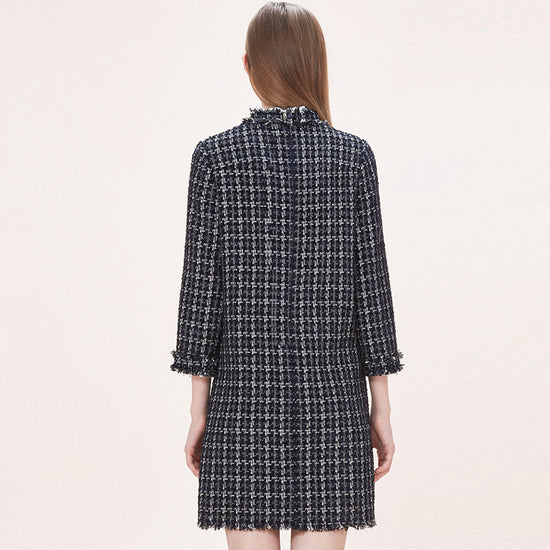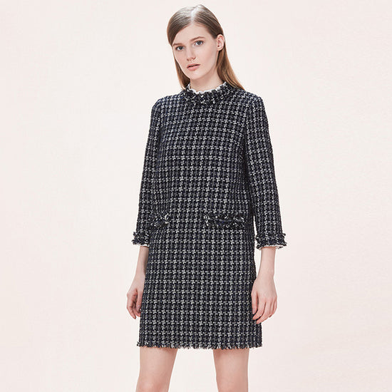 Craquez pour cette robe tweed véritable noire avec ses manches longues. Son haut à une encolure ronde brodée et sa jupe se présente avec des franges aux extrémités.