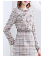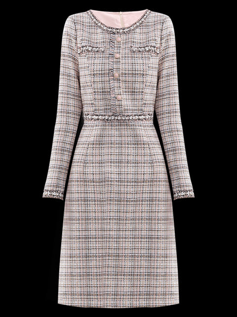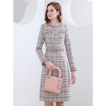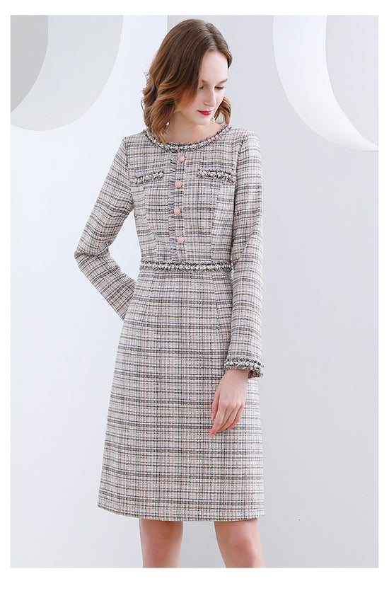 Incontournable de la garde-robe des habits de cérémonies ! Cette robe pour femme en tweed est idéale pour toutes les occasions, qu'elle soit décontractée ou habillée. Elle se présente avec une encolure ronde, des manches longues et une taille marquée par des broderies.